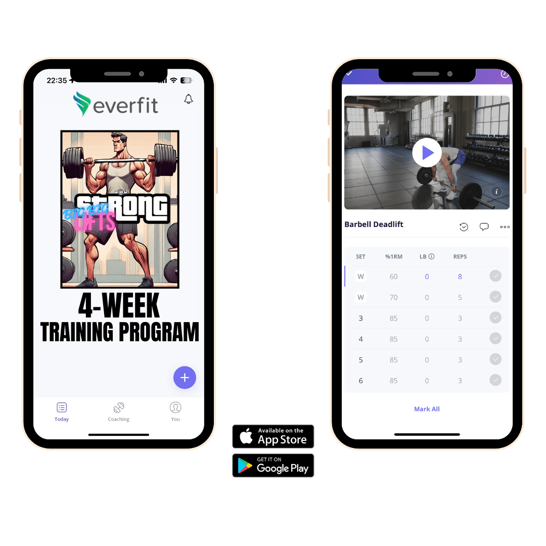- 4x Week training program with 4x sessions per week (made up of 4 preparation exercises and 2 primary lifting exercises and 3 complimentary accessory lifts) all provided through an online application on your mobile device.